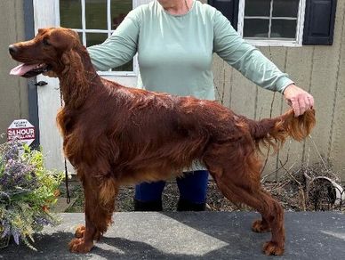 Int/Nat CH Enjoy Motley Acres Irish Goldset I call him Big Red. He was imported from Timisoara, Romania. His parents are Champion's from Hungary, Romania and Serbia. Big Red is a gorgeous dark male that sires gorgeous puppies. Big Red is one of the darkest Irish setters I have ever seen. In the sun his coat is almost purple. Big Red hates to show he is very happy running around with his girl friends.